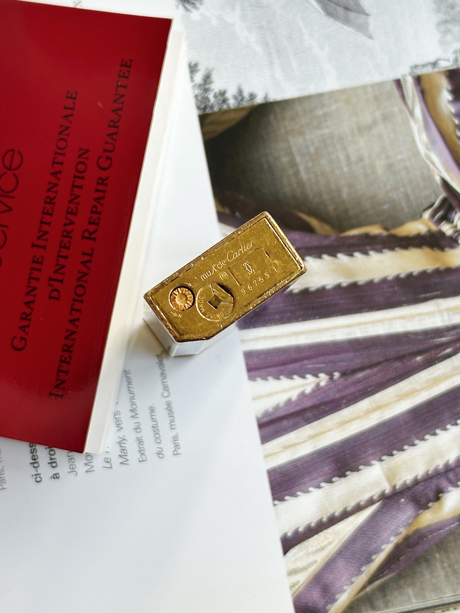 With its sleek, pentagonal silhouette, this lighter immediately stands out from more classic designs. The midnight blue lacquered panels offer a striking contrast to the gold contours, creating a graphic aesthetic typical of Cartier creations. The Must de Cartier logo appears in gold on the front, discreet yet iconic. The underside of the lighter reveals the Must de Cartier – Swiss Made engraving, as well as the serial number, which is exactly the same as the one printed on the accompanying paperwork.