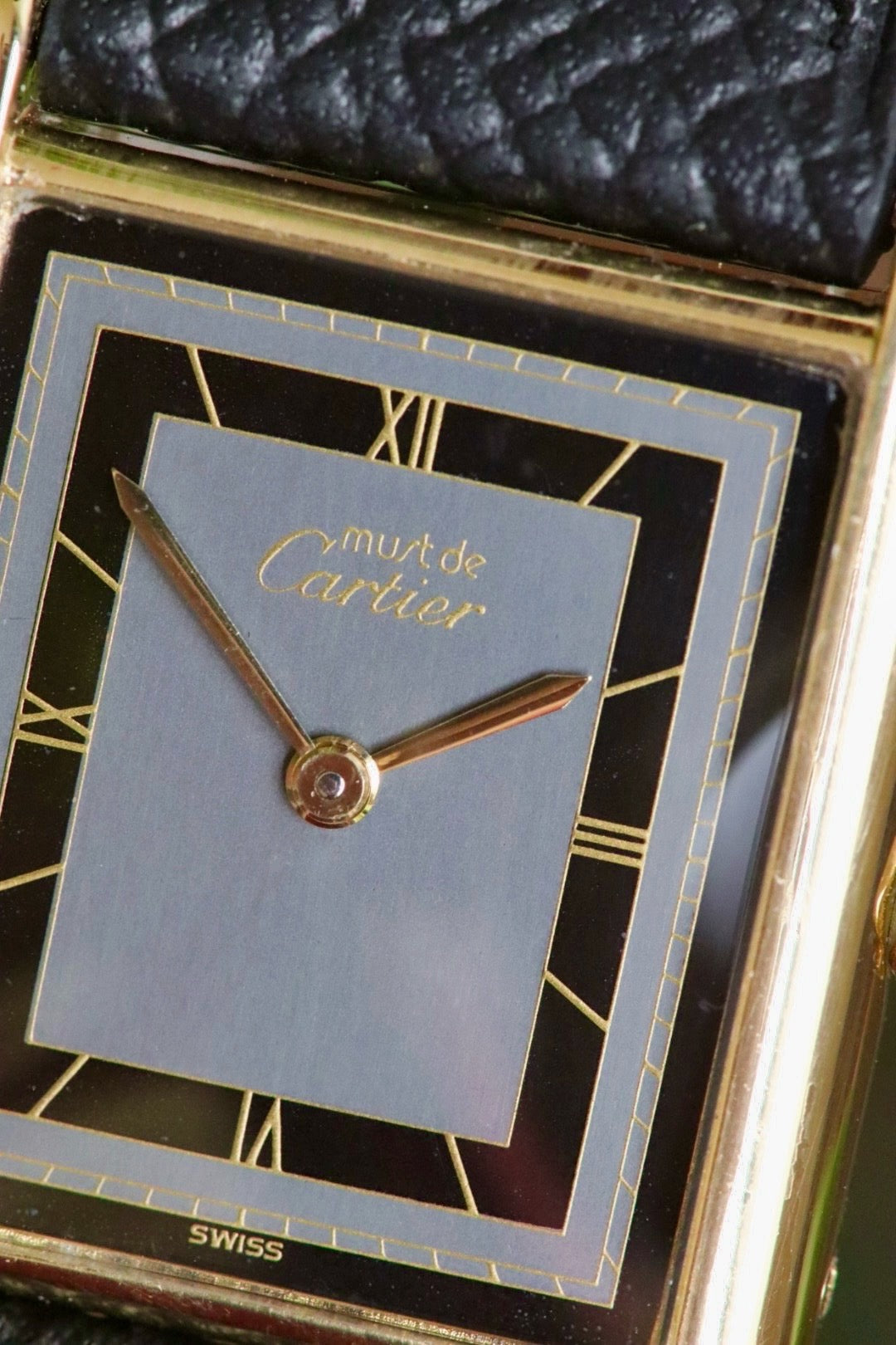 Le cadran gris à chiffres romains de cette Tank Must apporte une touche contemporaine tout en conservant l’ADN classique de Cartier. Les aiguilles dorées s’accordent harmonieusement au ton chaud du boîtier, tandis que la signature « Must de Cartier » rappelle l’histoire prestigieuse de la collection.