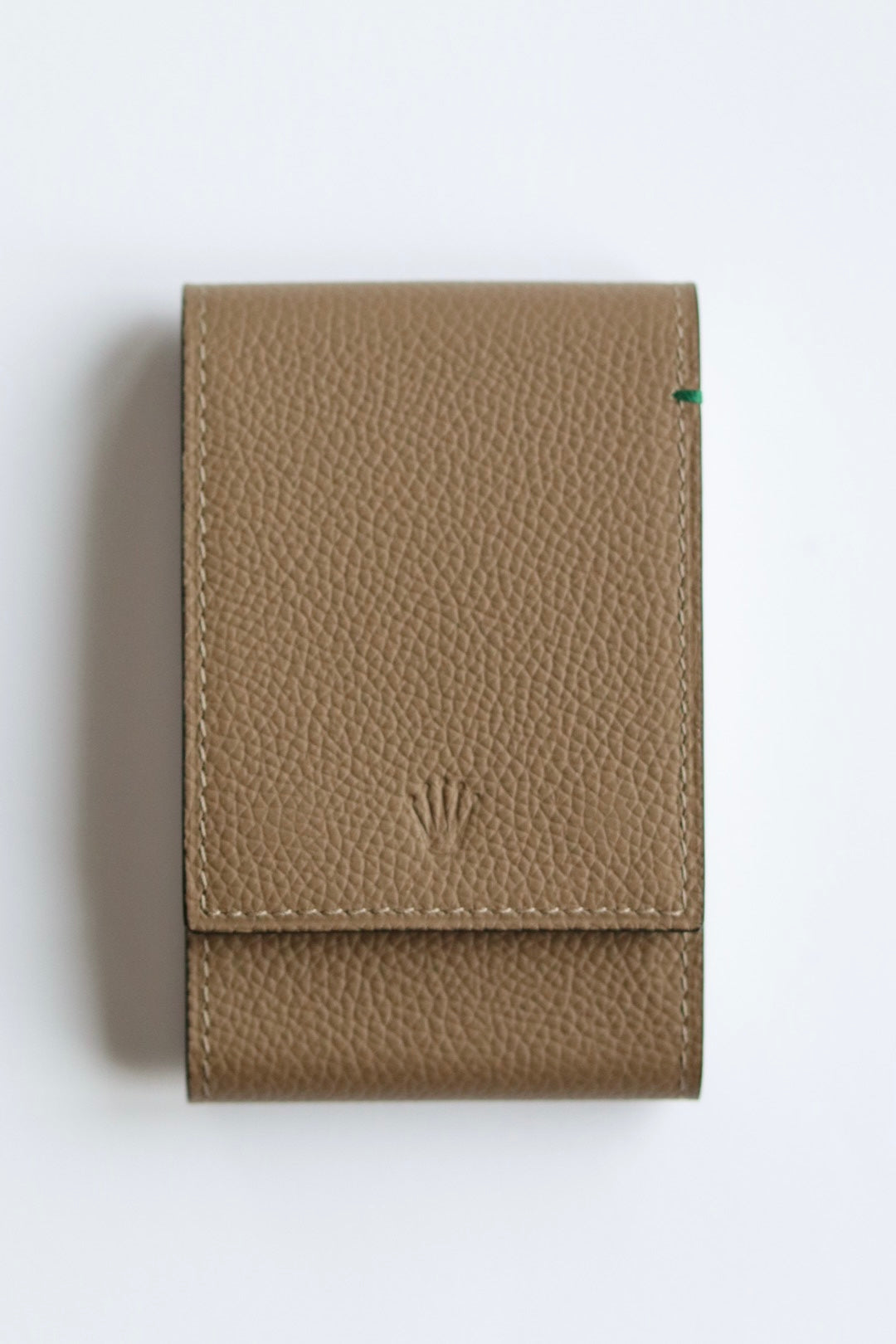 Réalisé dans un somptueux cuir grainé taupe, cet étui de 11,5 cm X 7 cm, séduit par son toucher luxueux, sa robustesse et son esthétique intemporelle. La couture verte, détail emblématique de la maison Rolex, souligne son raffinement. Sa conception soignée permet d’accueillir votre montre en toute sécurité, tout en offrant une présentation élégante et sobre. Le logo Rolex subtilement embossé sur la face avant complète son allure prestigieuse.
