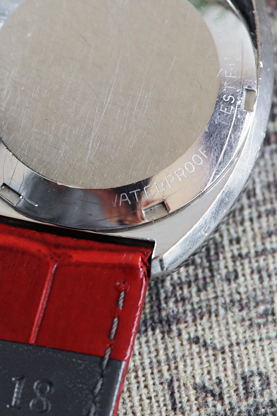 Cette montre est montée sur un bracelet neuf en cuir rouge, soigneusement sélectionné pour faire écho à l’aiguille de chronographe. Une boucle ardillon Omega en acier vient compléter l’ensemble pour une touche de modernité discrète mais affirmée.