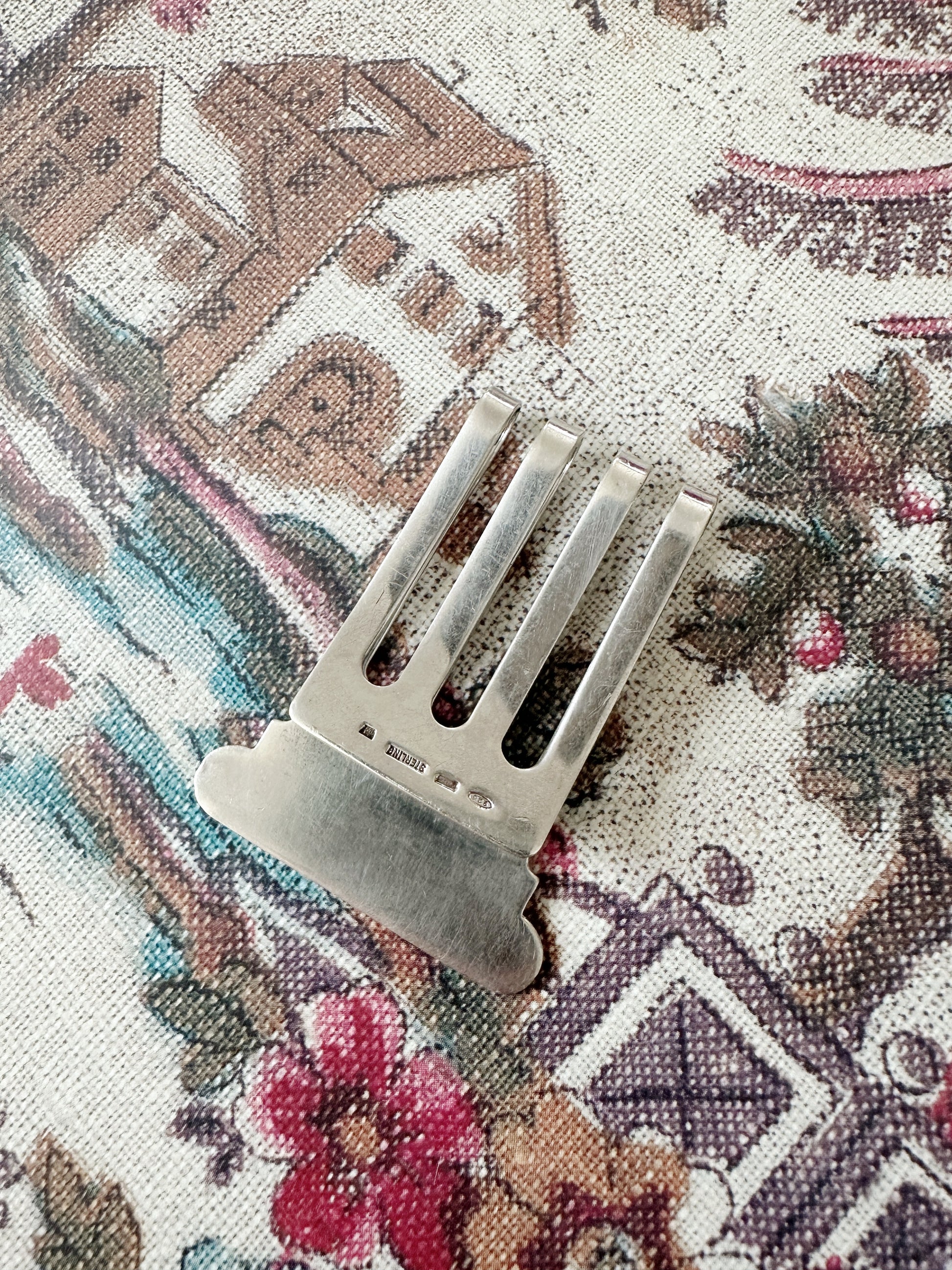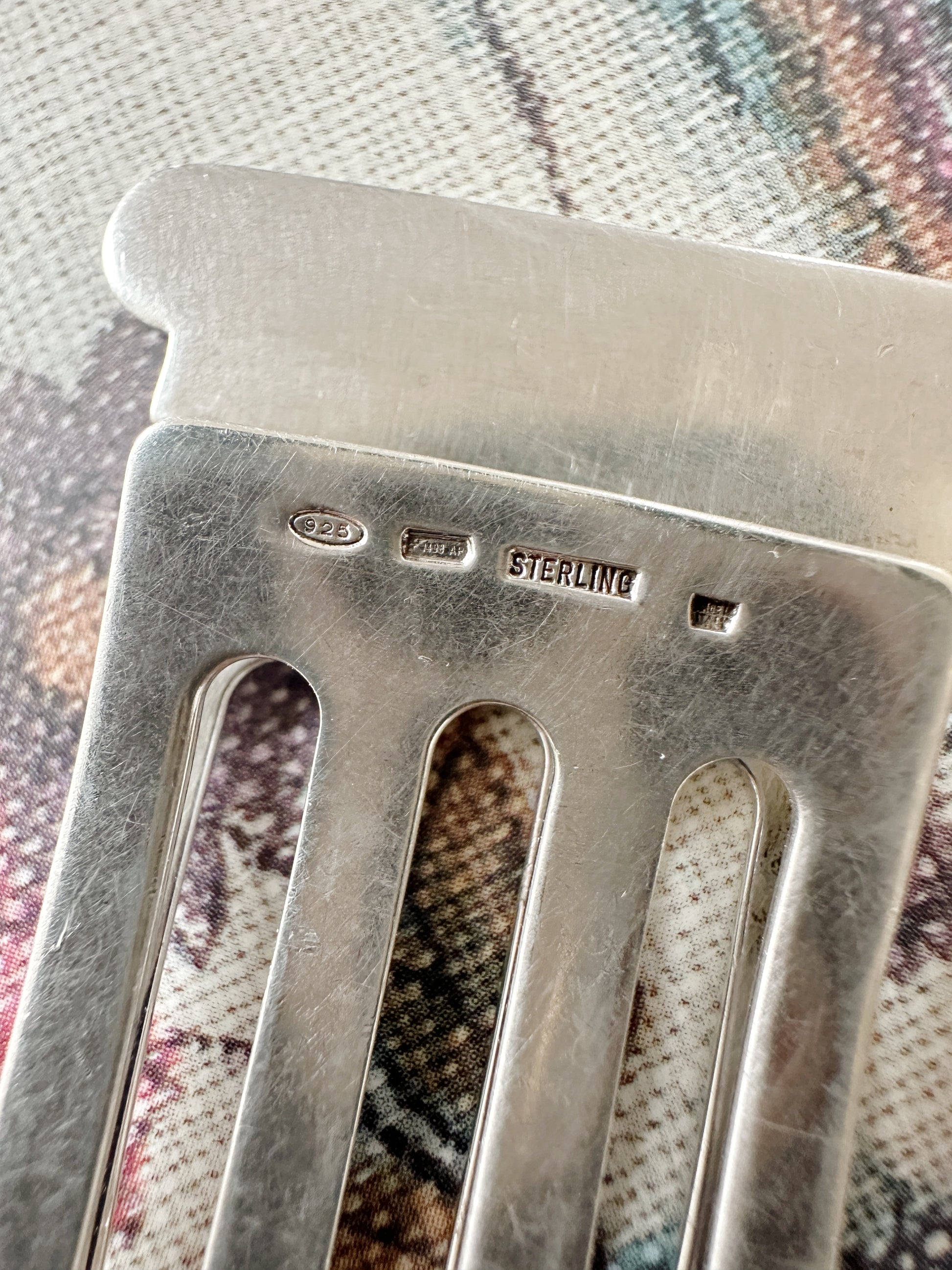 Réalisée en argent sterling 925, cette pince présente les poinçons visibles attestant de son authenticité : marquage BVLGARI, poinçon 925 et mention STERLING. Son design ajouré, finement travaillé, offre un équilibre parfait entre modernité et tradition. L’argent massif révèle une belle patine naturelle, gage de caractère et d’authenticité.