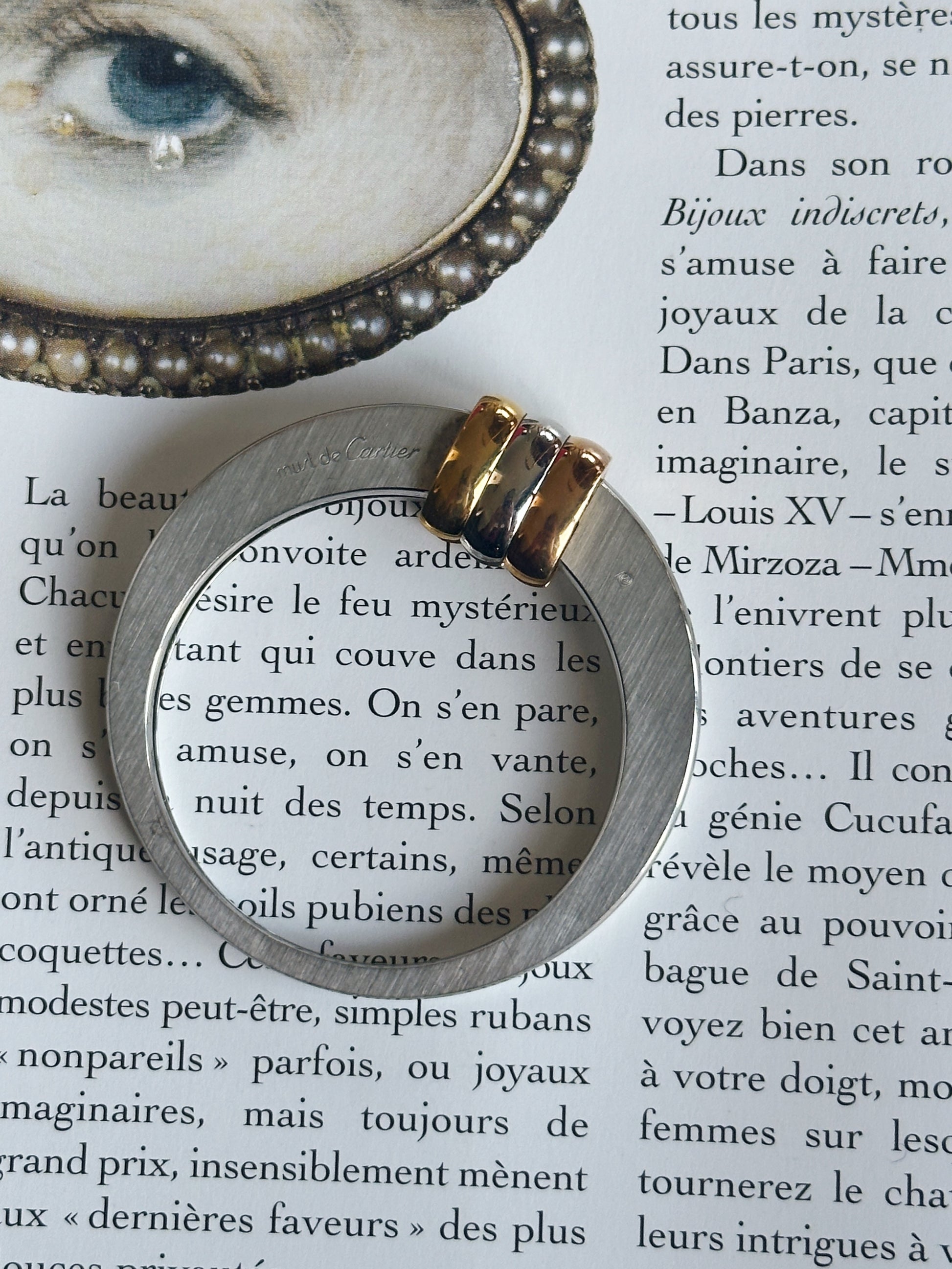 This money clip has an unusual round shape, with a diameter of 4.8 cm . Its brushed steel structure gives it a modern and sophisticated look, while the three decorative rings – yellow gold, rose gold and silver – directly recall the iconic “Trinity” aesthetic of the House of Cartier.