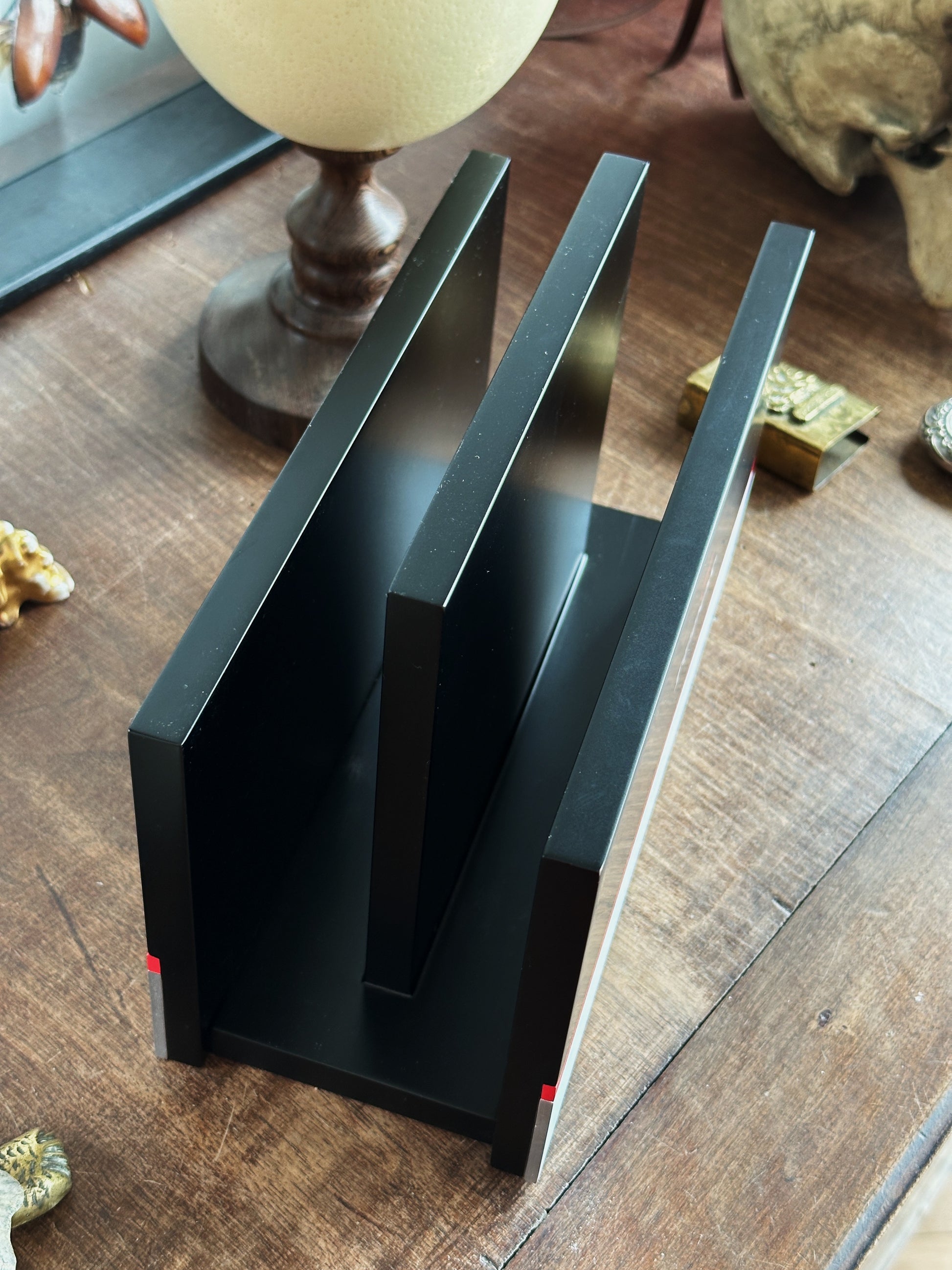 Constructed from dense, solid resin , this display stand is built to last. Its two compartments offer convenient storage for several documents or magazines. The black velvet base ensures perfect stability on any surface without risk of slipping. Despite a minor, discreet flaw , it remains in very good overall condition .
