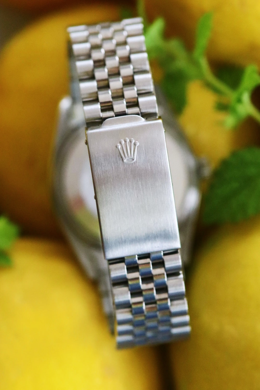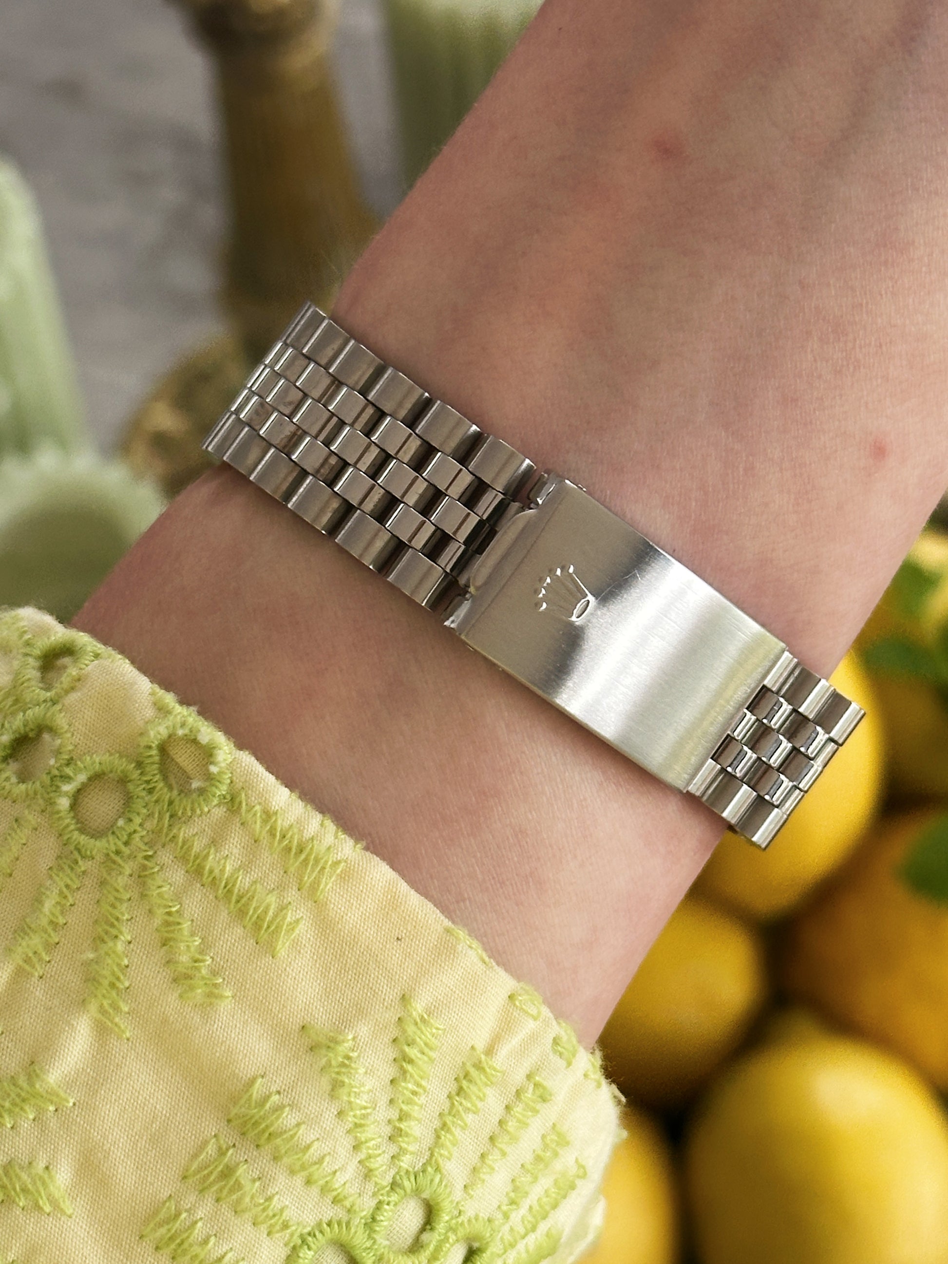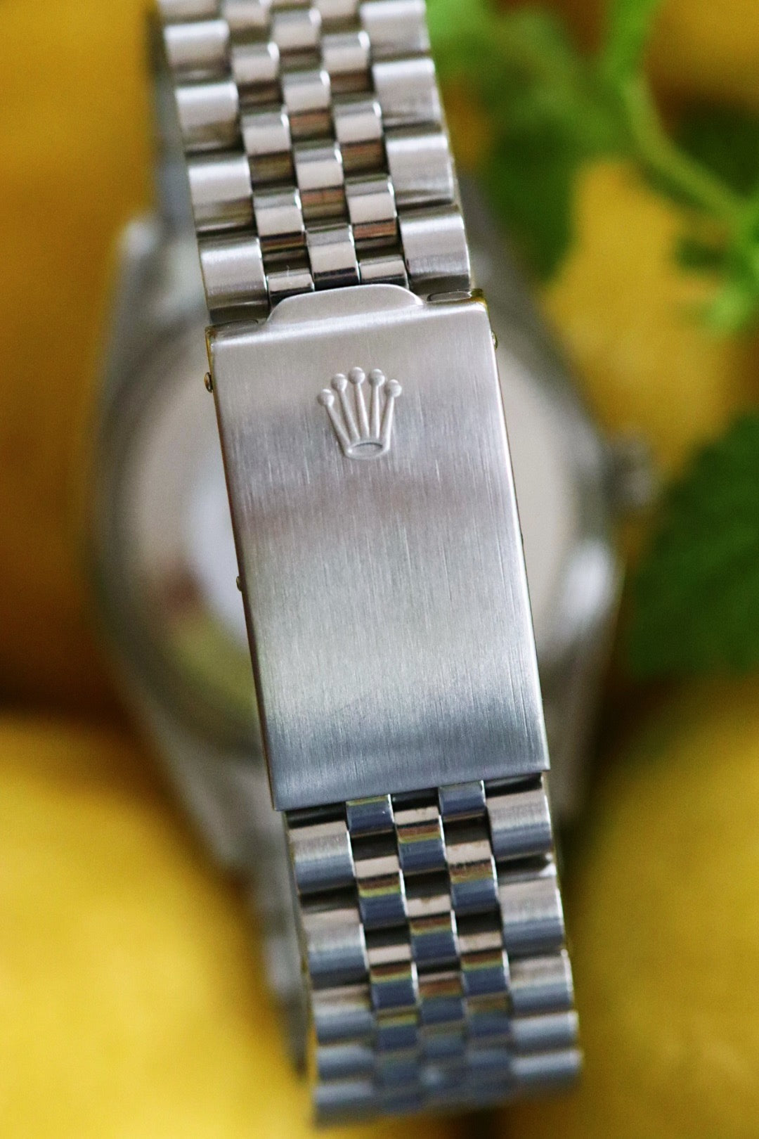 The 36mm case is mounted on a stainless steel Jubilee bracelet with a circumference of 19cm. It retains its original folding clasp reference 62510H . This buckle model corresponds precisely to the Datejust & Jubilee bracelets shown on the 1601 from 1974.