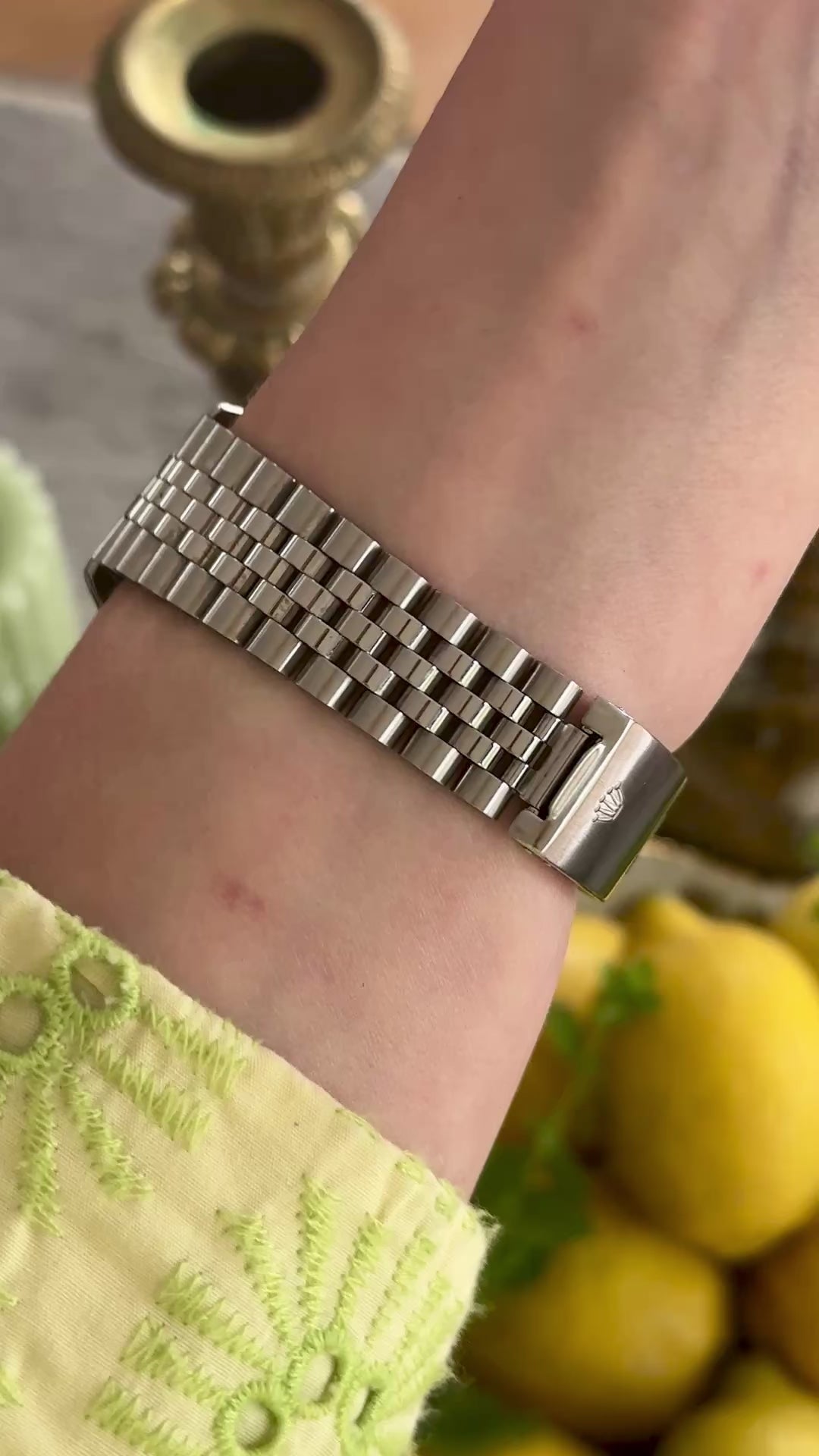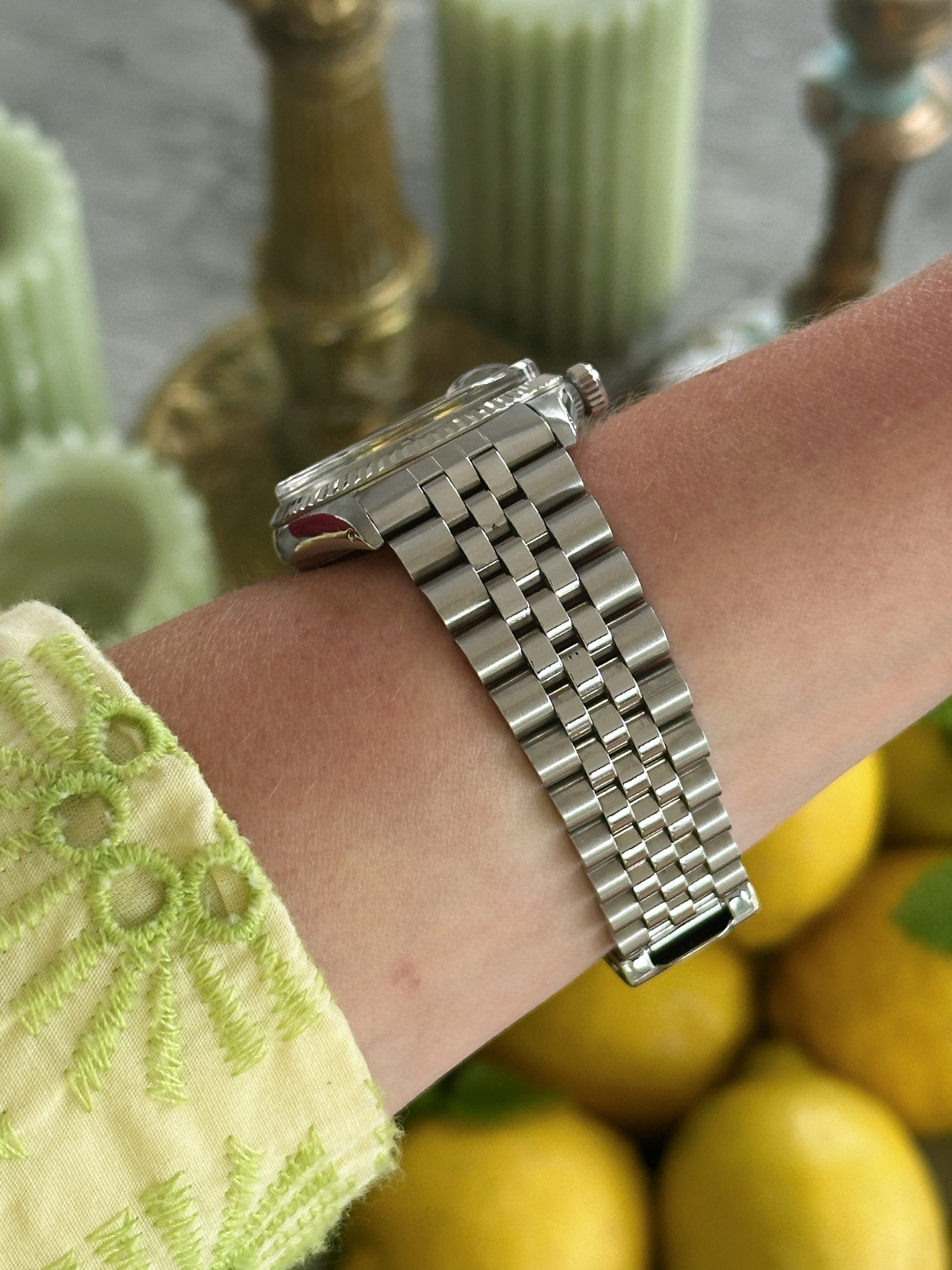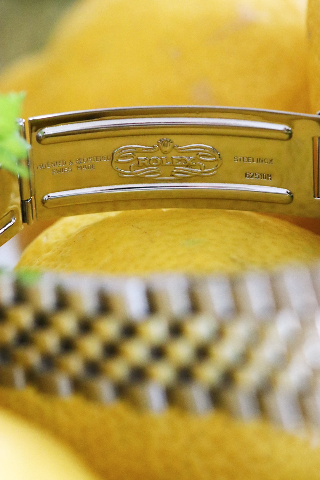The 36mm case is mounted on a stainless steel Jubilee bracelet with a circumference of 19cm. It retains its original folding clasp reference 62510H . This buckle model corresponds precisely to the Datejust & Jubilee bracelets shown on the 1601 from 1974.