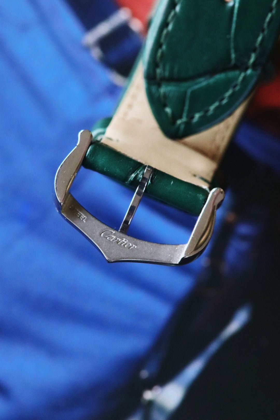 La couronne perlée en acier ornée d’un spinelle synthétique bleu en forme de cabochon constitue l’une des signatures les plus emblématiques de Cartier, apportant une touche joaillière raffinée. La montre est montée sur un bracelet d’origine en cuir d’alligator vert, parfaitement assorti au cadran, renforçant l’harmonie chromatique et le caractère luxueux de cette version.