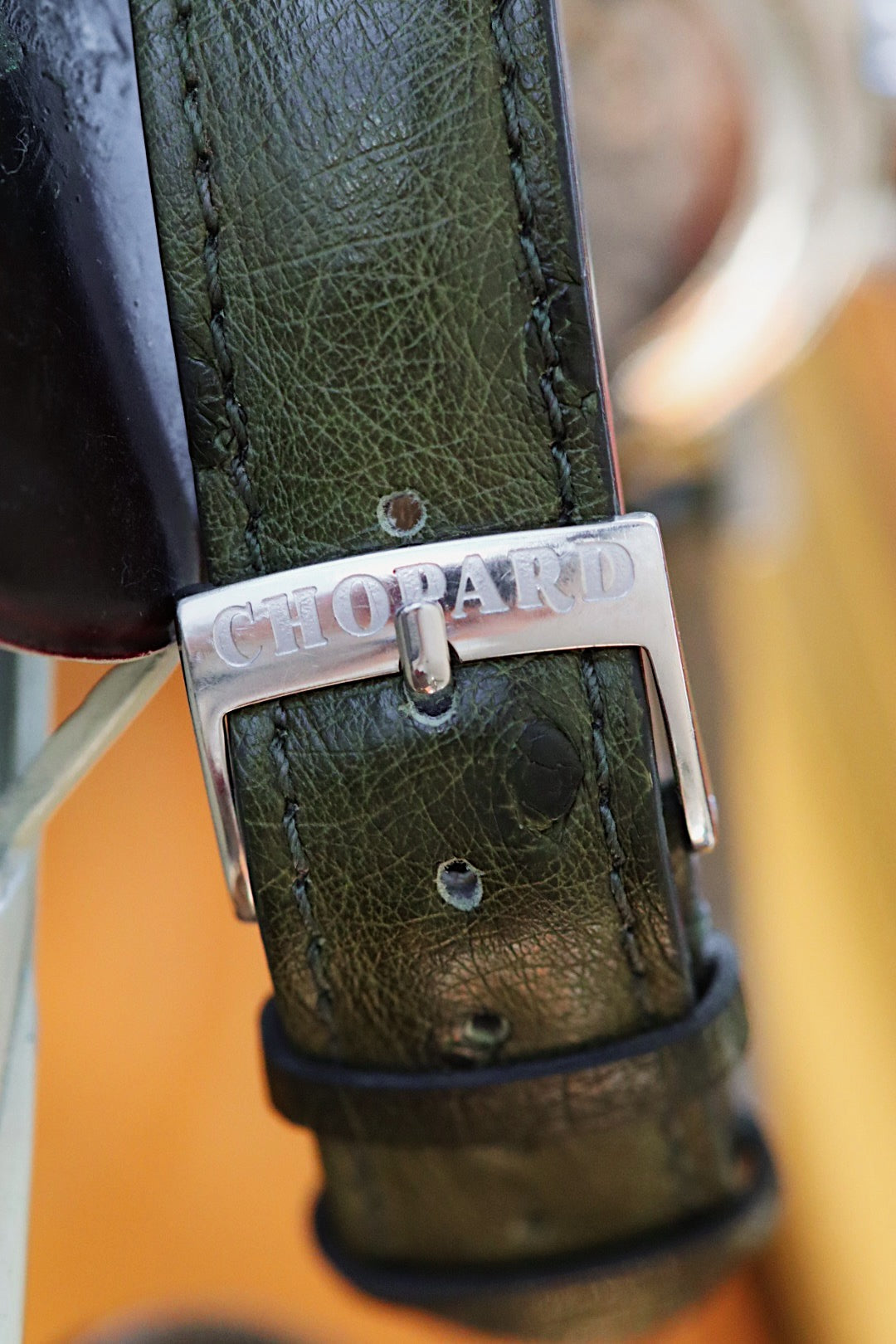 Il est associé à une boucle ardillon Chopard d’origine, visible sur les photos, gage d’authenticité et de cohérence avec la montre.