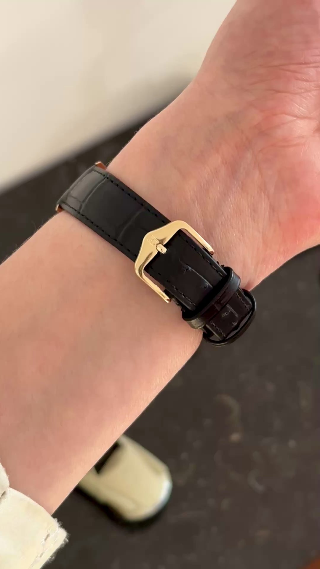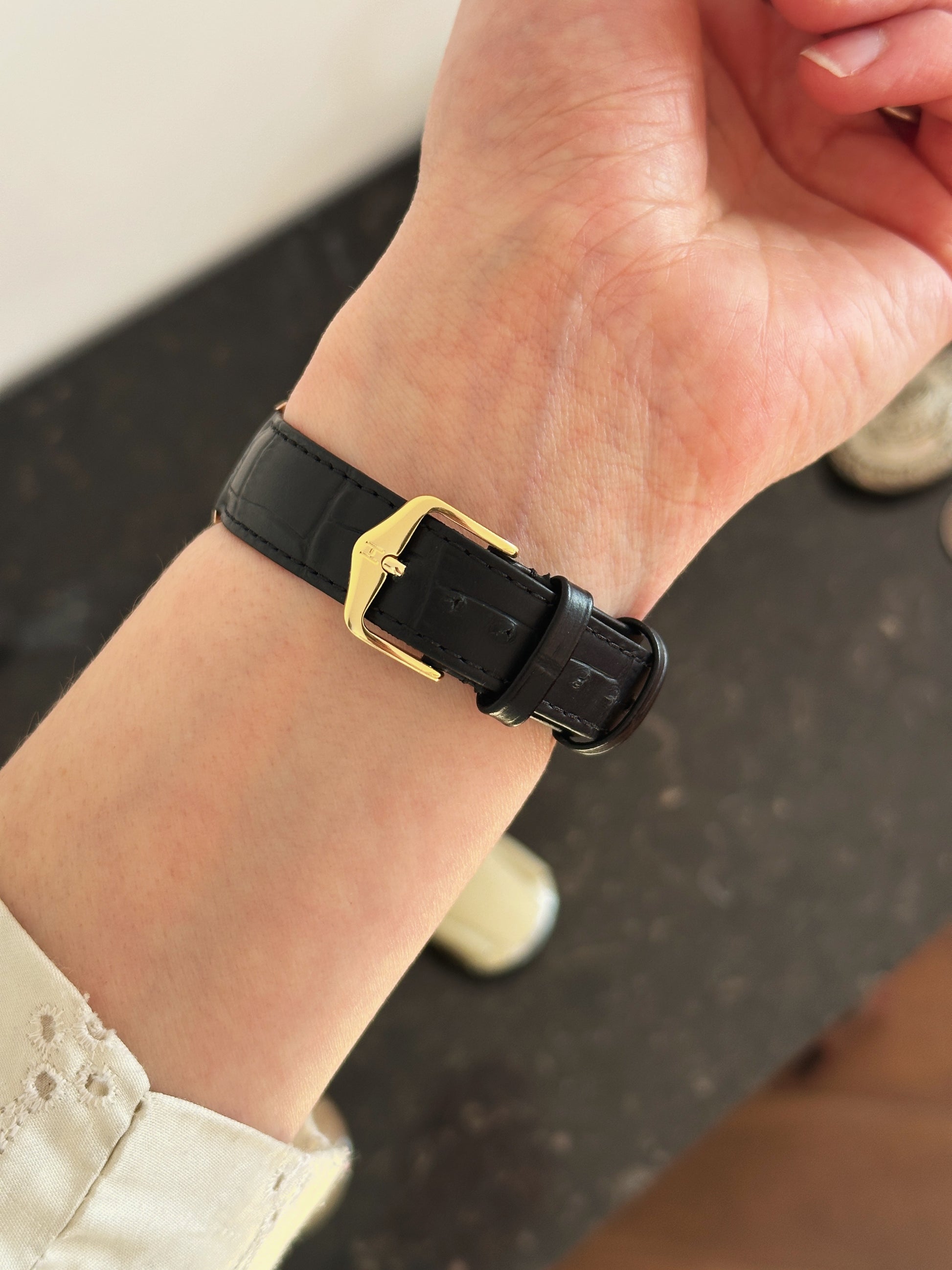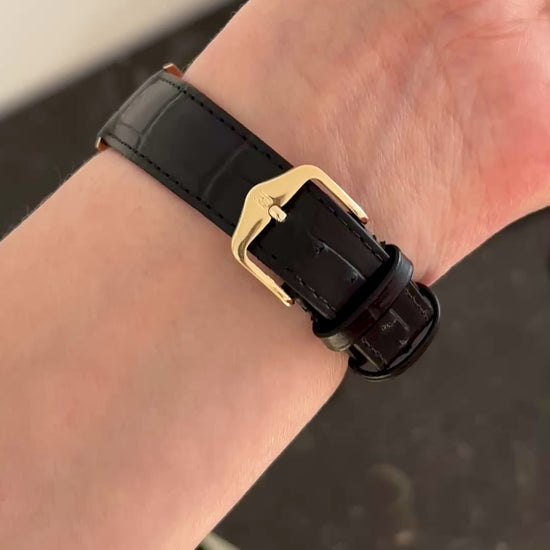 La montre est montée sur un bracelet en cuir noir neuf et élégant, parfaitement assorti à l’esprit habillé de la pièce. Il est complété par une boucle ardillon plaquée or qui s’harmonise avec le boîtier.