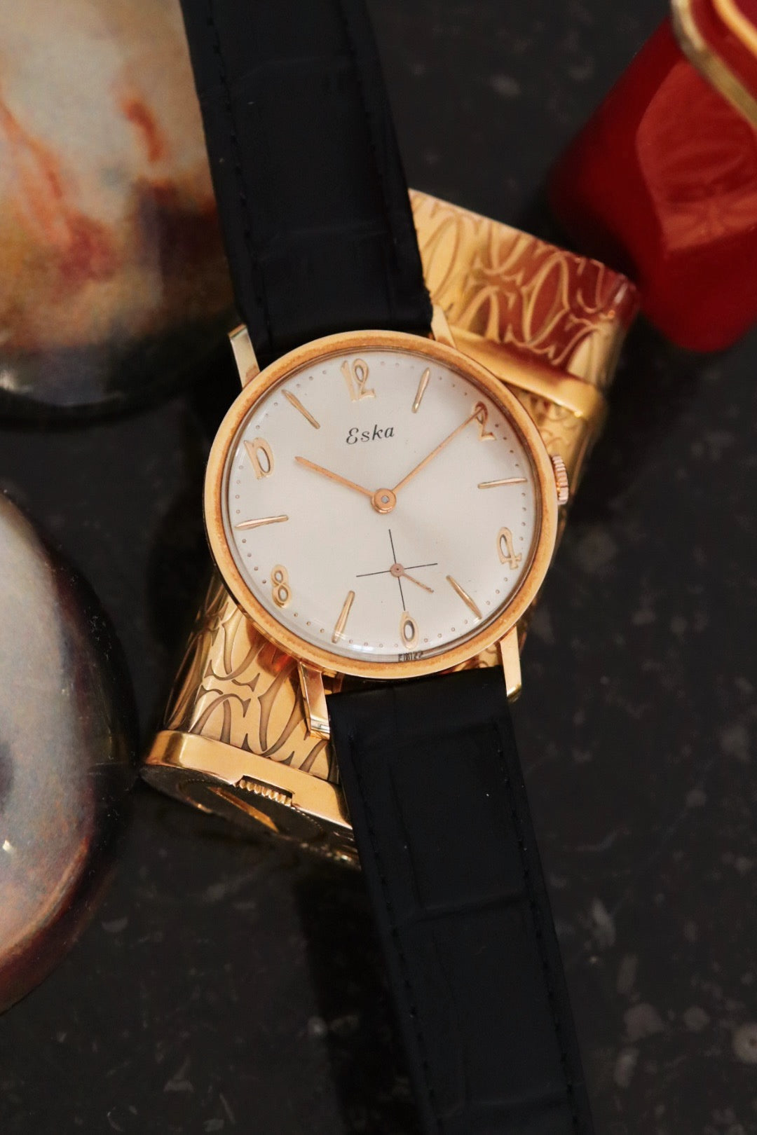 Sélectionnée avec soin par Mr Neville Watches, cette superbe montre Eska incarne l’élégance horlogère suisse des années 1960. Avec son cadran nacré lumineux, ses chiffres arabes dorés et son boîtier plaqué or à la patine chaleureuse, elle offre une présence rare et raffinée au poignet.