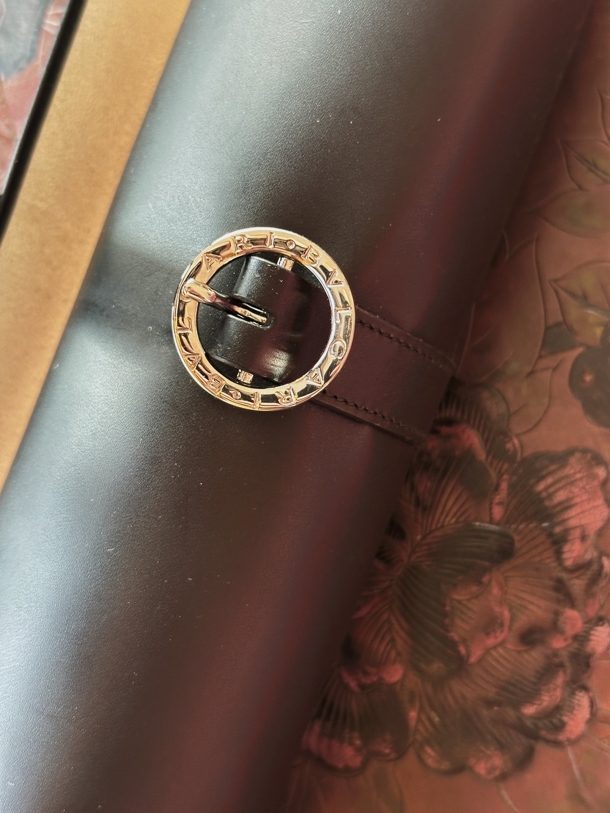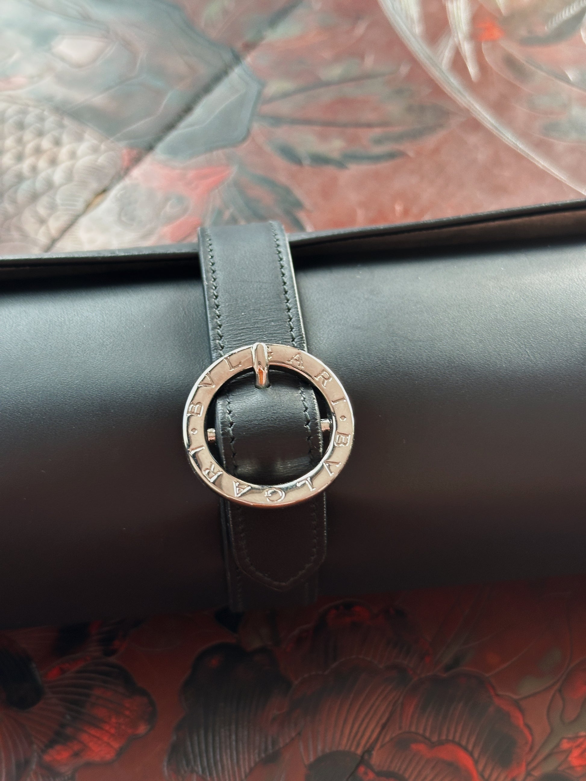 Le cuir noir présente une très belle patine, avec de légères marques superficielles liées à un usage soigneux, sans altérer son élégance. La boucle circulaire en argent, gravée Bulgari, apporte une touche iconique immédiatement reconnaissable, signature de la maison.