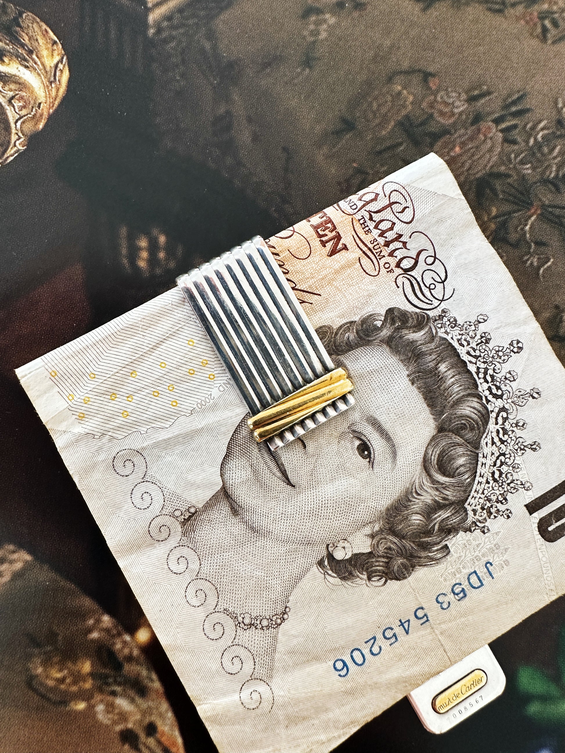 Fabriquée en France, cette pince reprend le design cannelé emblématique inspiré des collections Santos et Vendôme de Cartier. L’association de l'argent et de l’or crée un contraste élégant, discret et luxueux.
