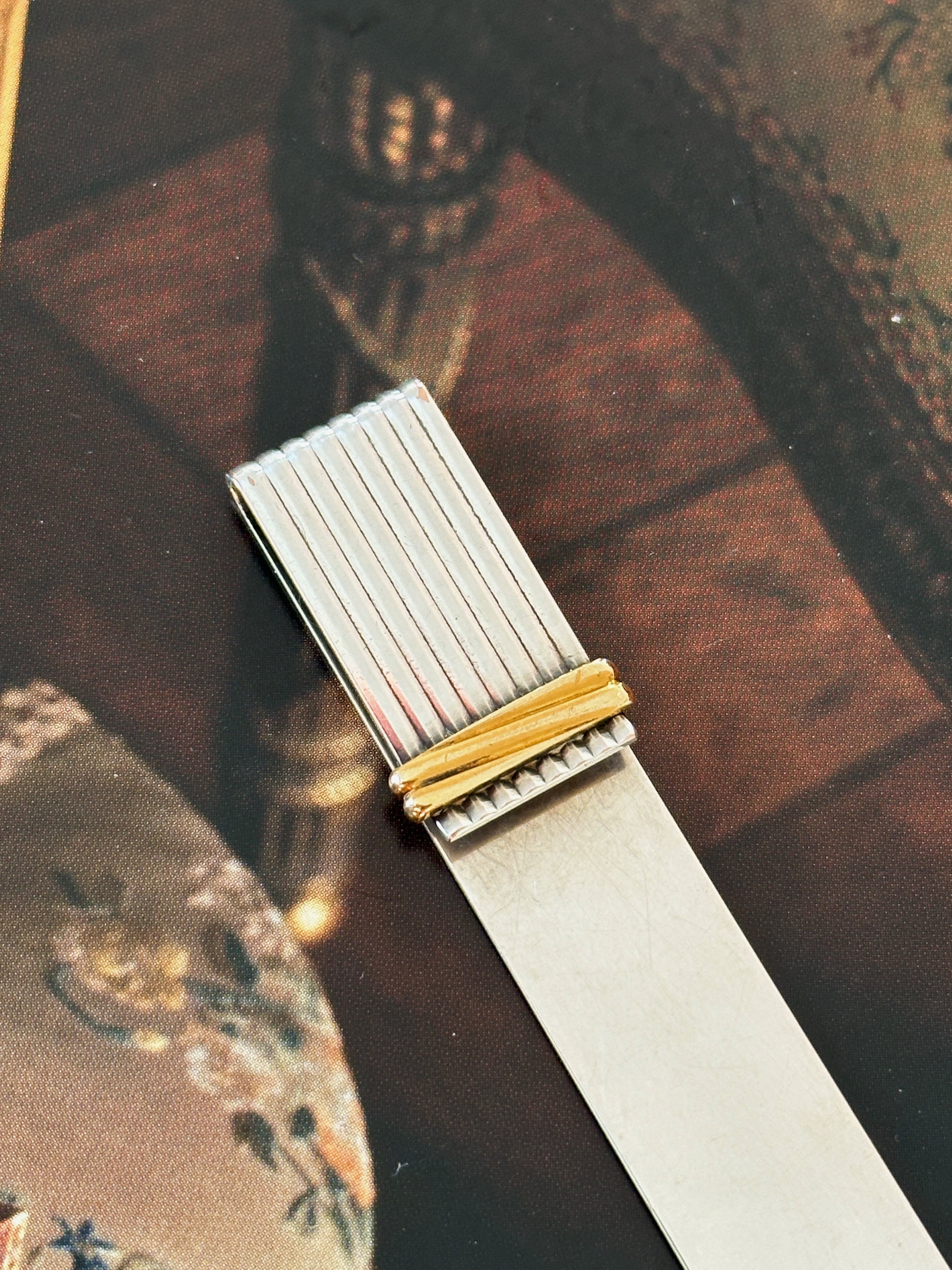 Mr Neville Watches vous propose cette sublime pince à billets / marque-pages Cartier Must, un accessoire de luxe emblématique mêlant métal argenté cannelé et barrette centrale plaquée or. Chic, sobre et intemporelle, cette pièce signée Cartier incarne le raffinement masculin à la française.