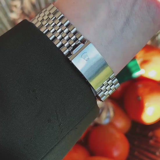 Cette 16014 est proposée avec son bracelet Jubilee d’origine réf. 62510H et ses end links 555, complété par une boucle déployante matching, code B (1977). Le bracelet Jubilee est un pilier de l’esthétique Datejust : souple, confortable et visuellement très “Rolex”, il apporte ce grain vintage qui fait la différence en vitrine comme au poignet.