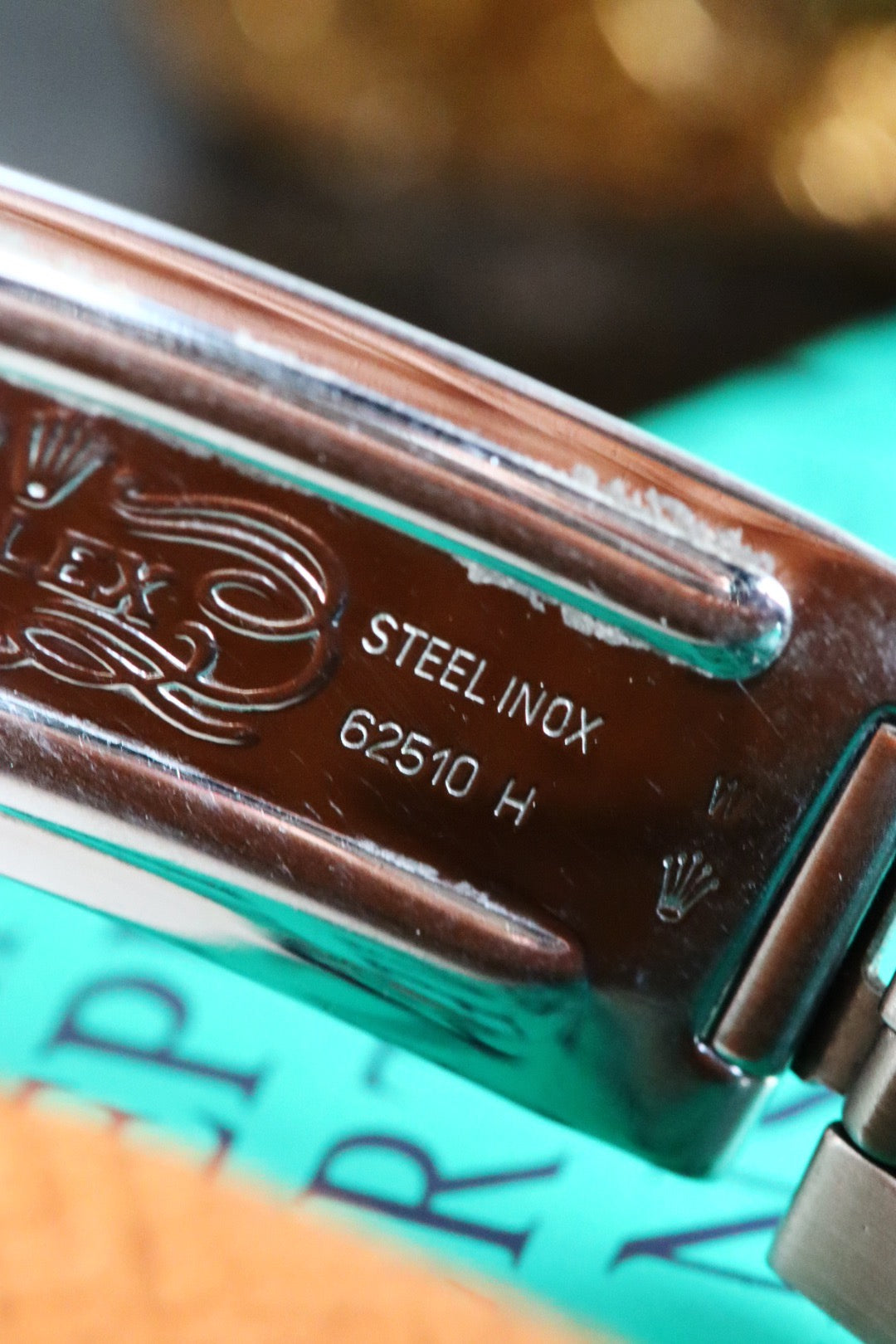 Le cadran bleu nuit offre une teinte intense et élégante, mettant en valeur les index appliqués et les aiguilles centrales. Protégé par un verre saphir, il garantit une excellente résistance aux rayures. Les index au tritium sont reconnaissables grâce à la mention « T-Swiss Made-T » située à 6 heures, détail recherché par les amateurs de montres Rolex vintage. La loupe cyclope permet une lecture claire et immédiate de la date.